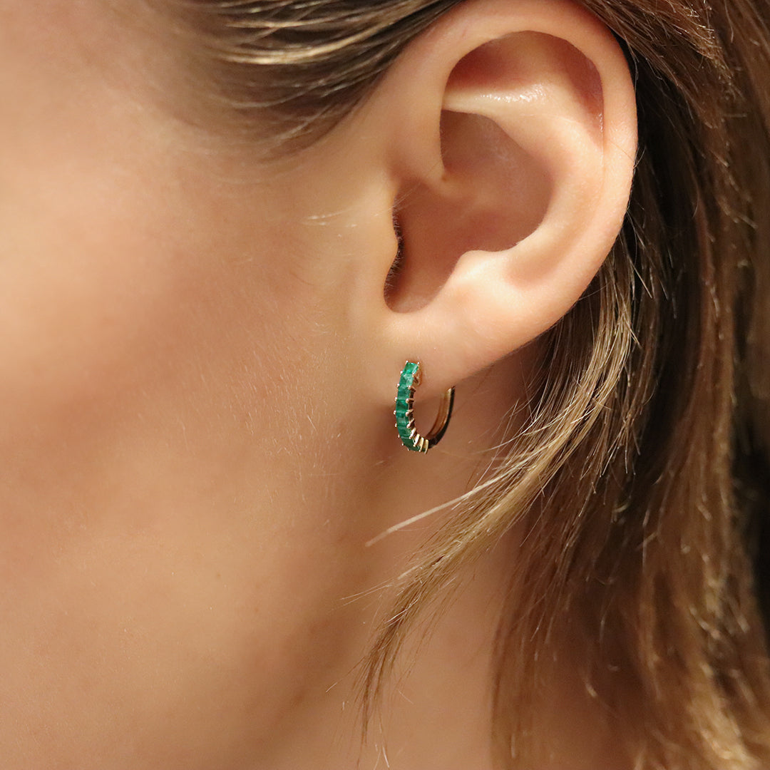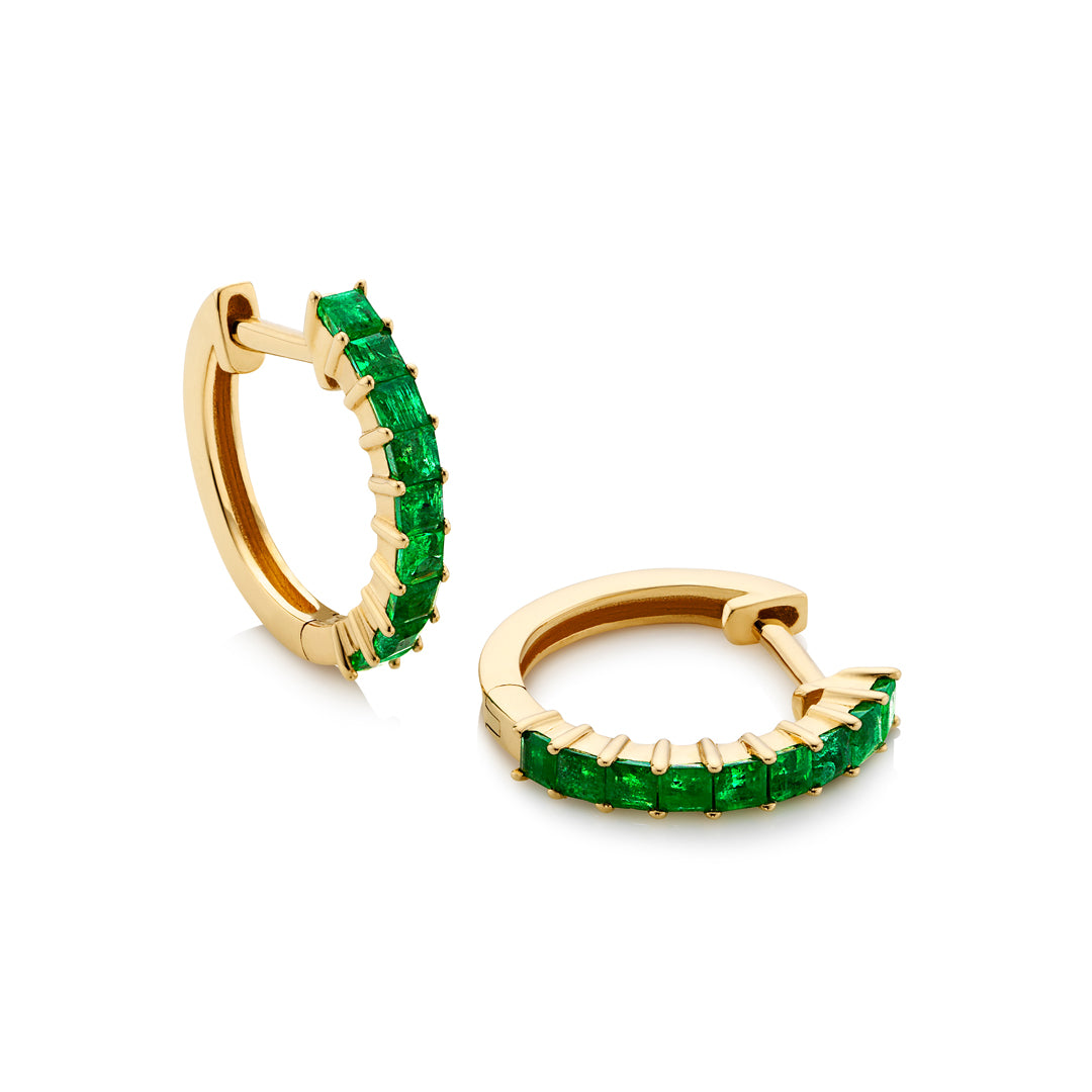 Emerald half-set 14 mm hoop earrings in 18ct yellow gold.