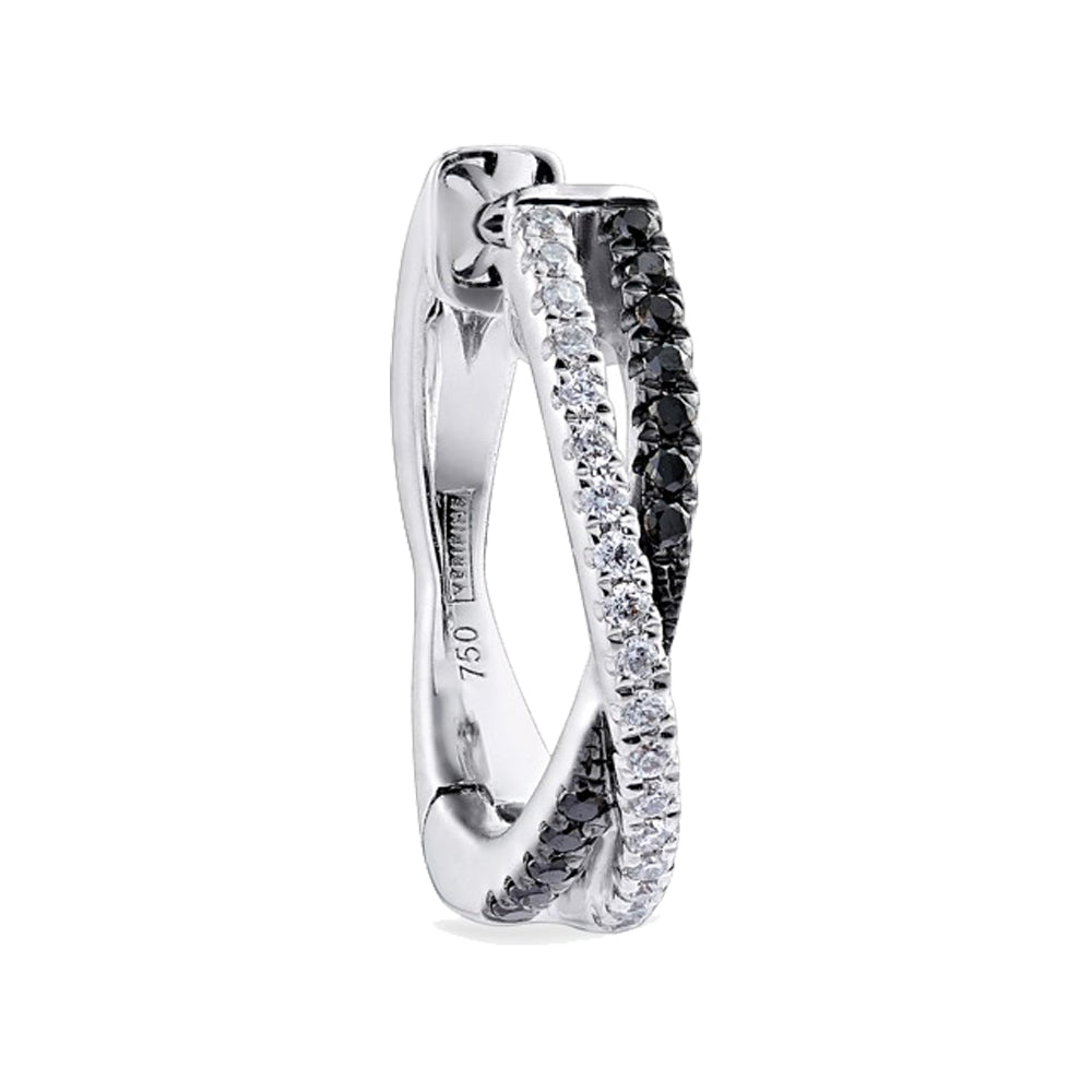 A pair of elegant round cross-over diamond hoop earrings cast from 18 carat white / yellow gold, featuring a pierced closure and 36 white diamonds and 24 black diamonds at the front of each hoop. These handcrafted small diamond hoop earrings are created to match our rings. Their timeless design makes them the perfect everyday signature.