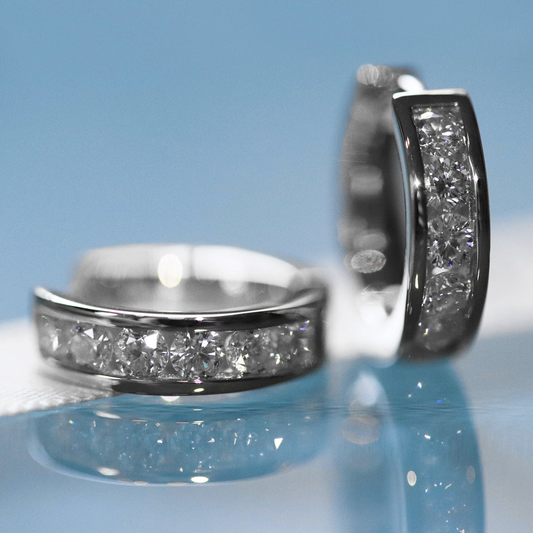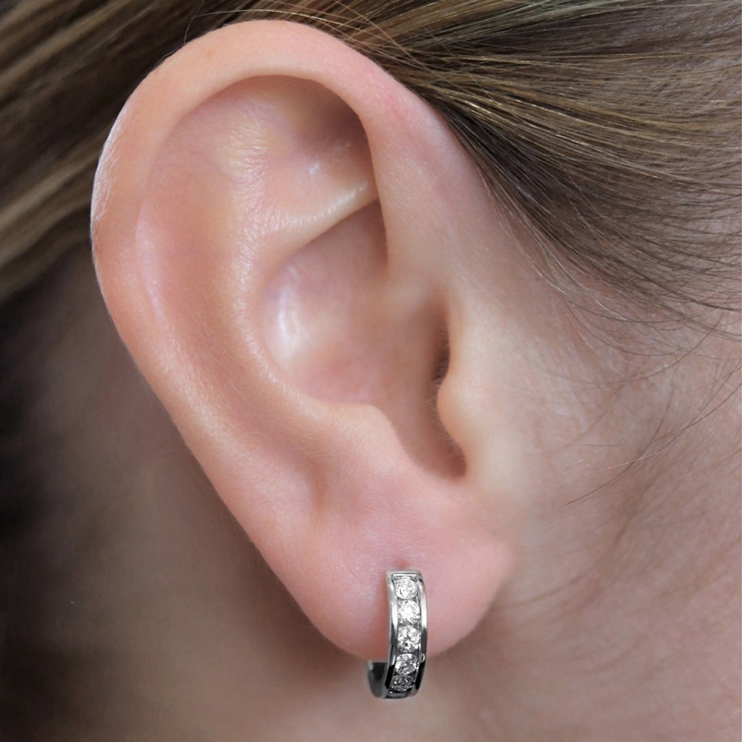 A pair of stylish wide small diamond hoop earrings. Hinged at the bottom, so that the pin can slide through your piercing and click securely back into place. These wide hoop earrings are half-set with diamonds. There are 6 diamonds set on the forward facing half of the hoop in each earring.