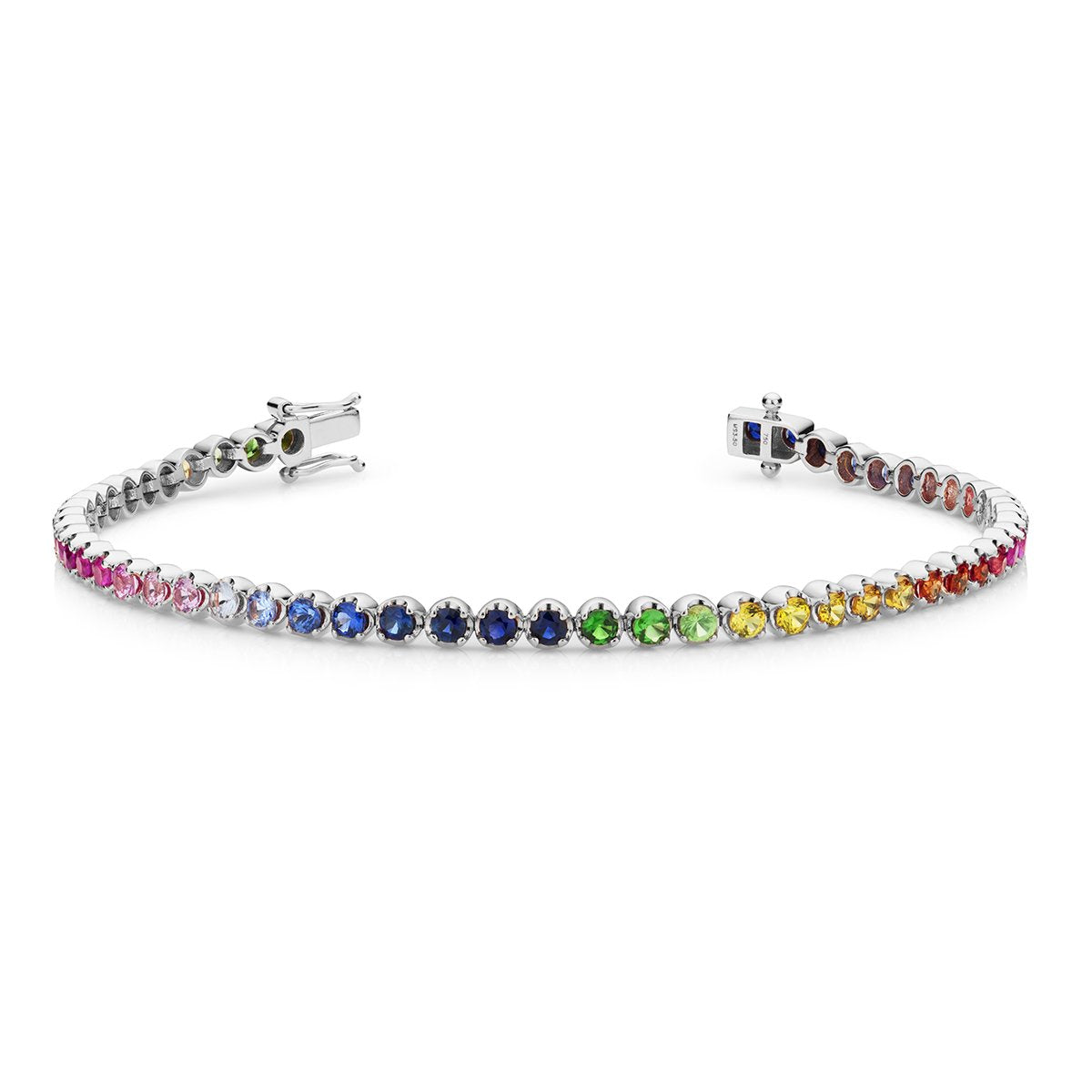 Classic tennis bracelet with round cut coloured stones.. This beautiful bracelet features a push clasp and is available in 18ct white, yellow or rose gold.