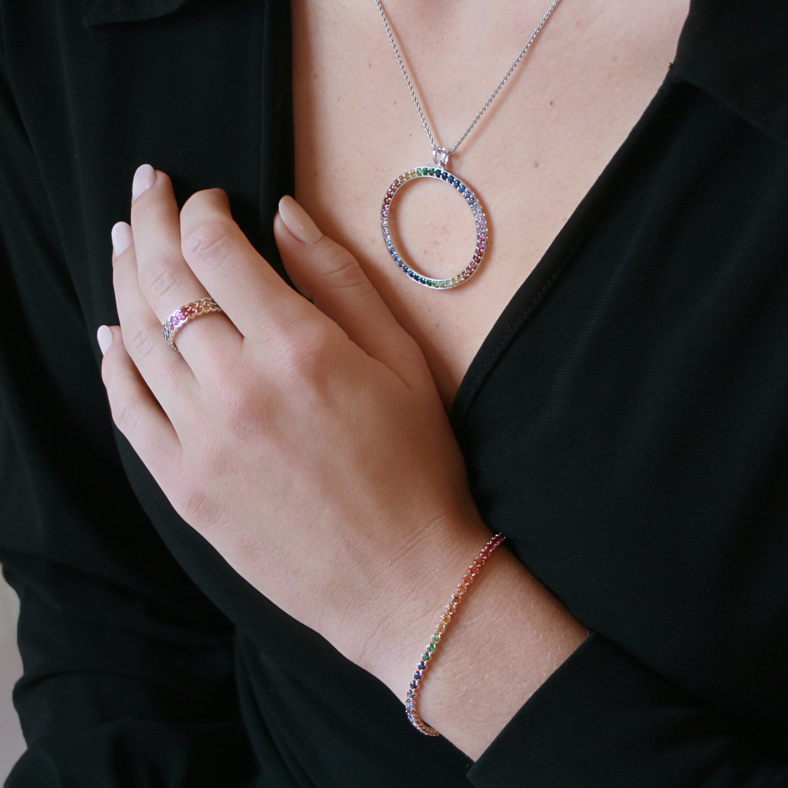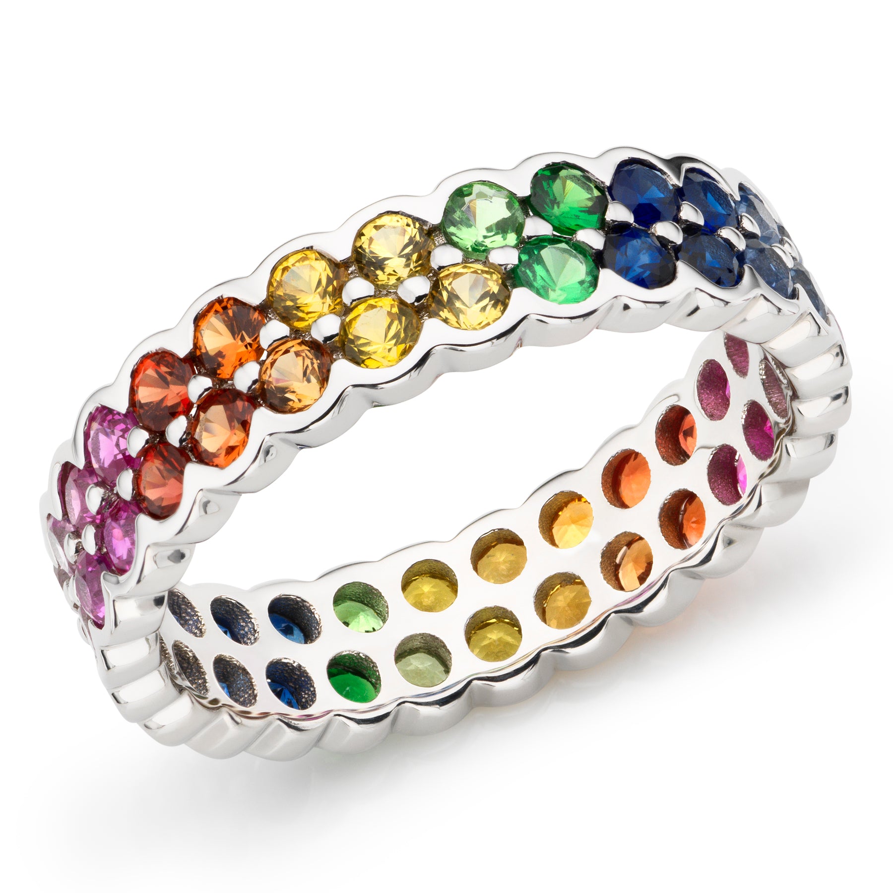 This Rainbow 18ct full white gold eternity ring is set with 2 rows of round-cut natural sapphires in purple, red, yellow, green and blue colours weighing a total of 2.43cts.