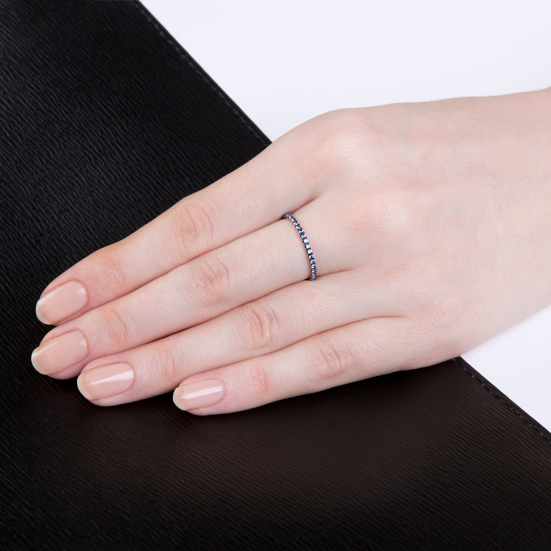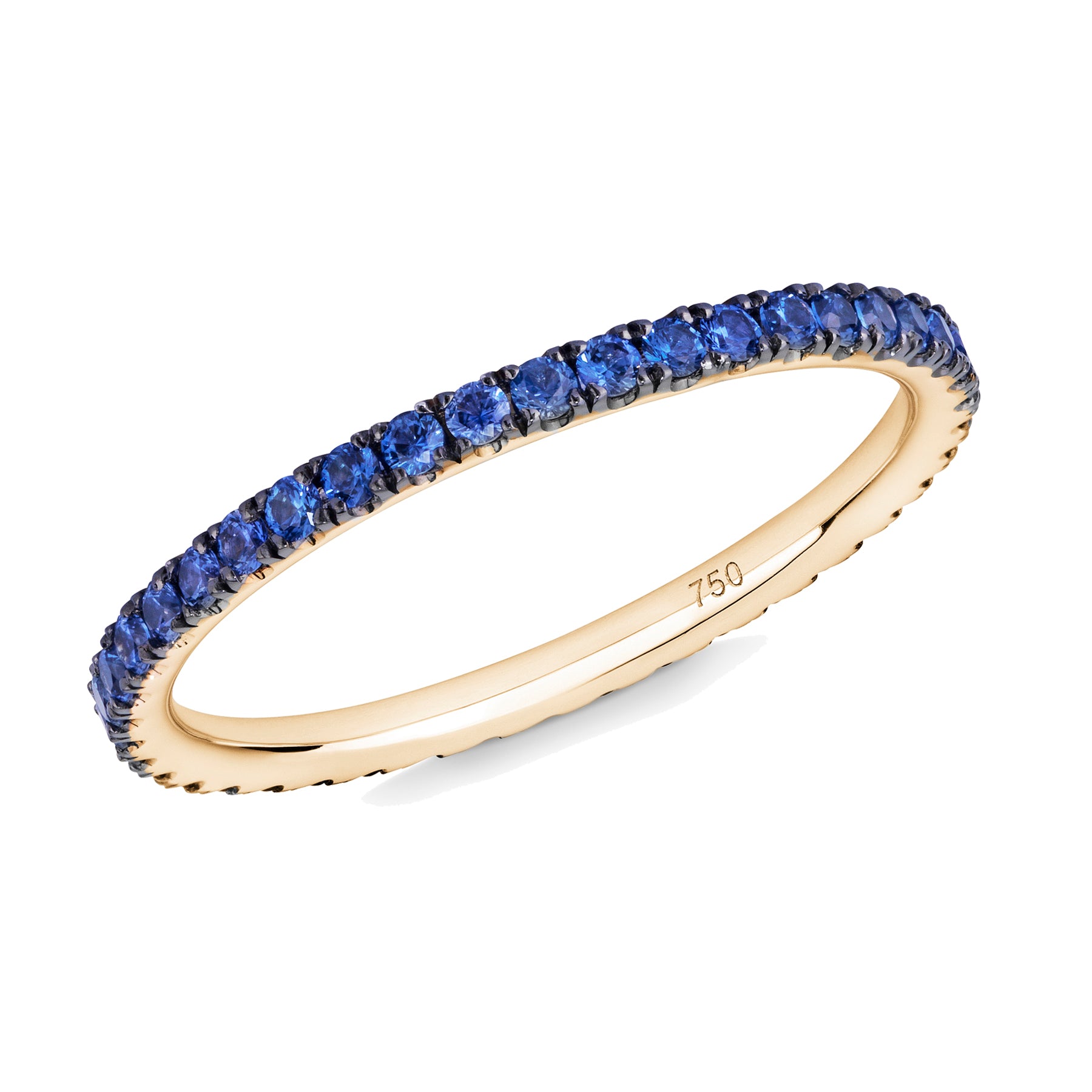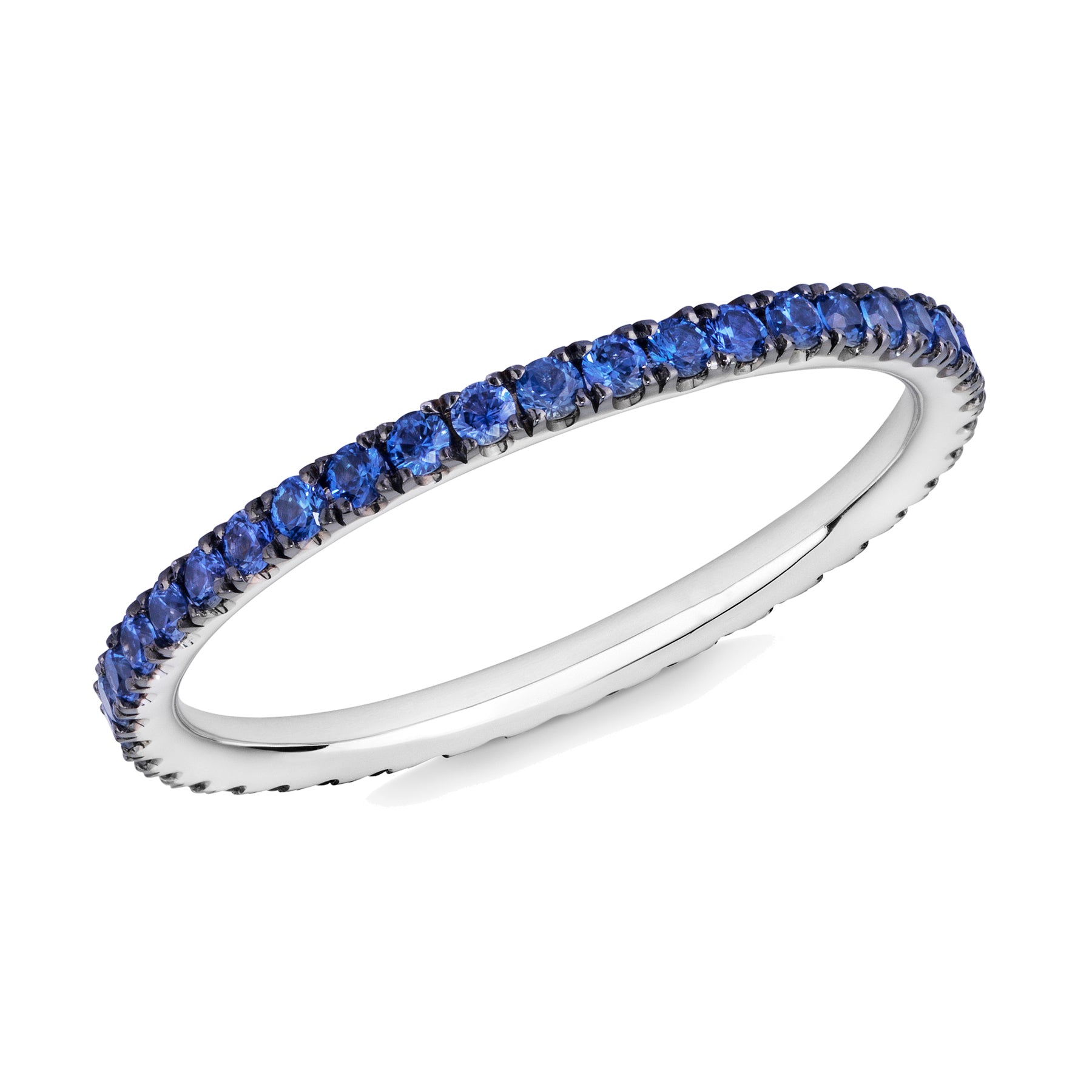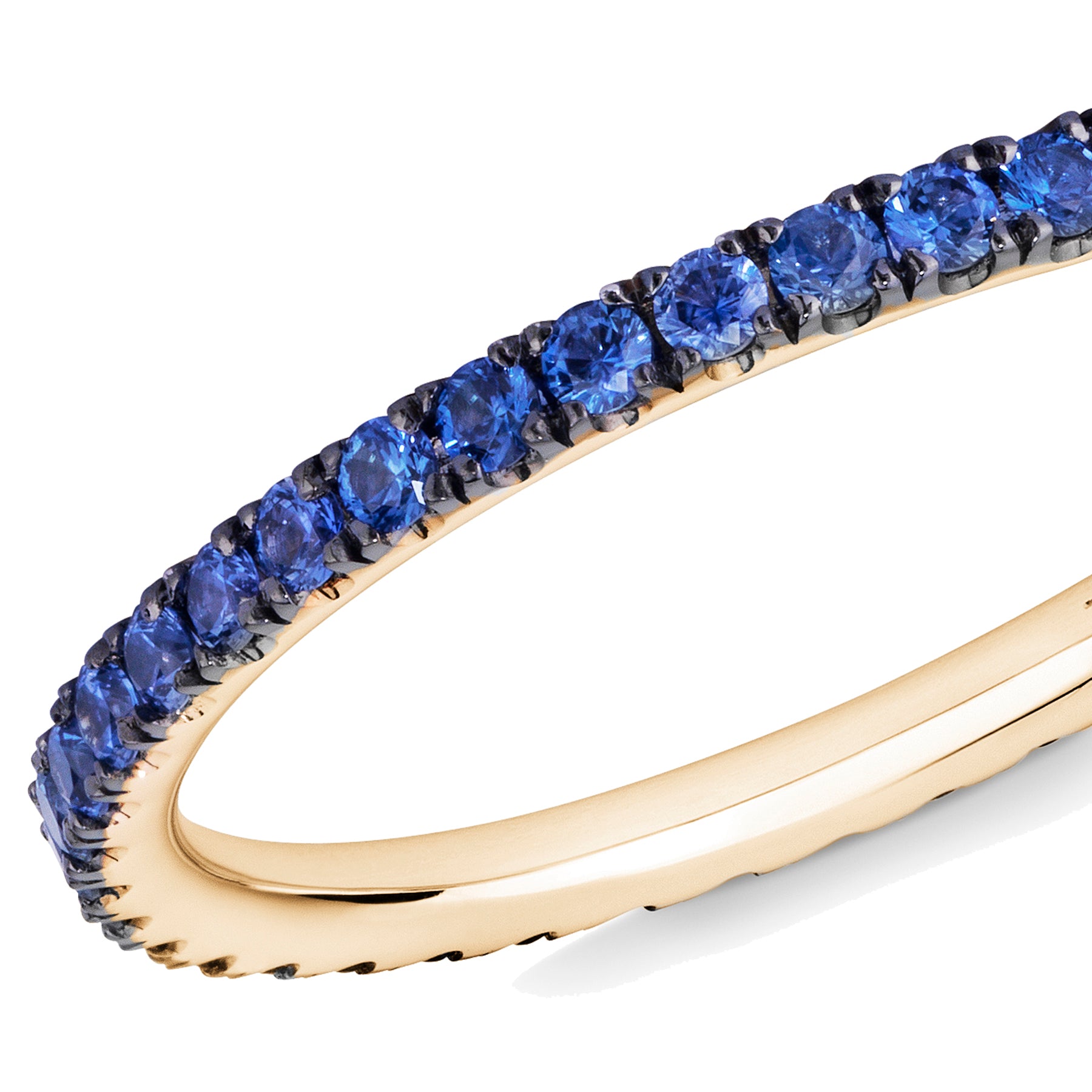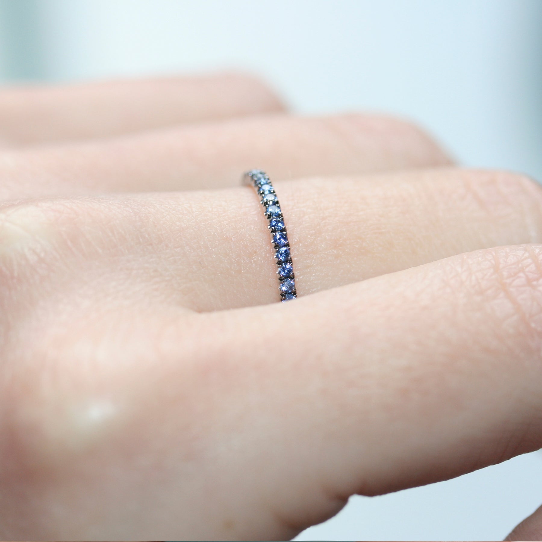 Ein schmaler, tiefblauer Vorsteckring, der durchgehend mit natürlichen blauen Saphiren besetzt ist, von denen jeder 1 Punkt wiegt. Wunderschön sowohl solo als auch in Kombination mit anderen schmalen Vorsteckringen von Verifine.