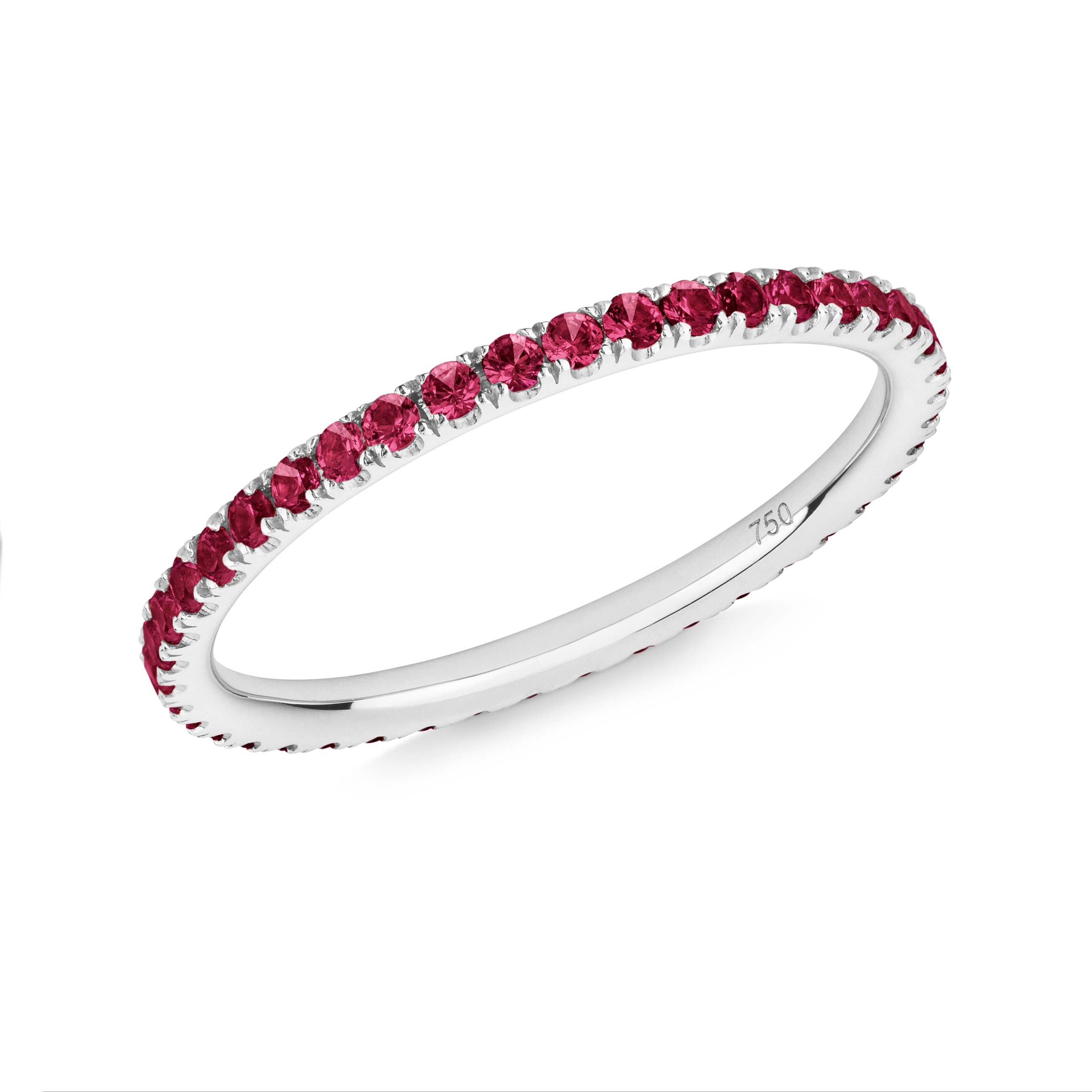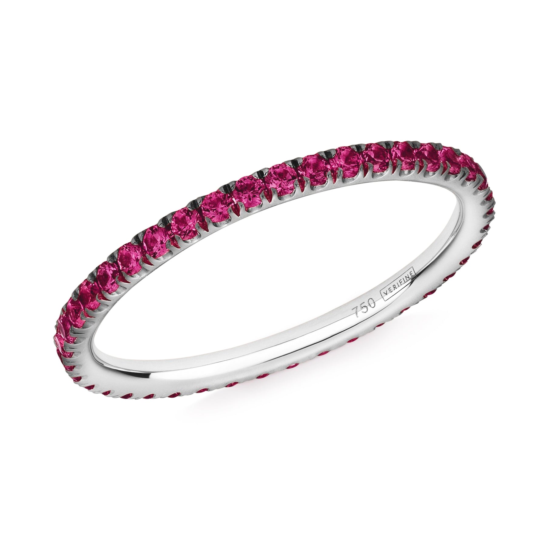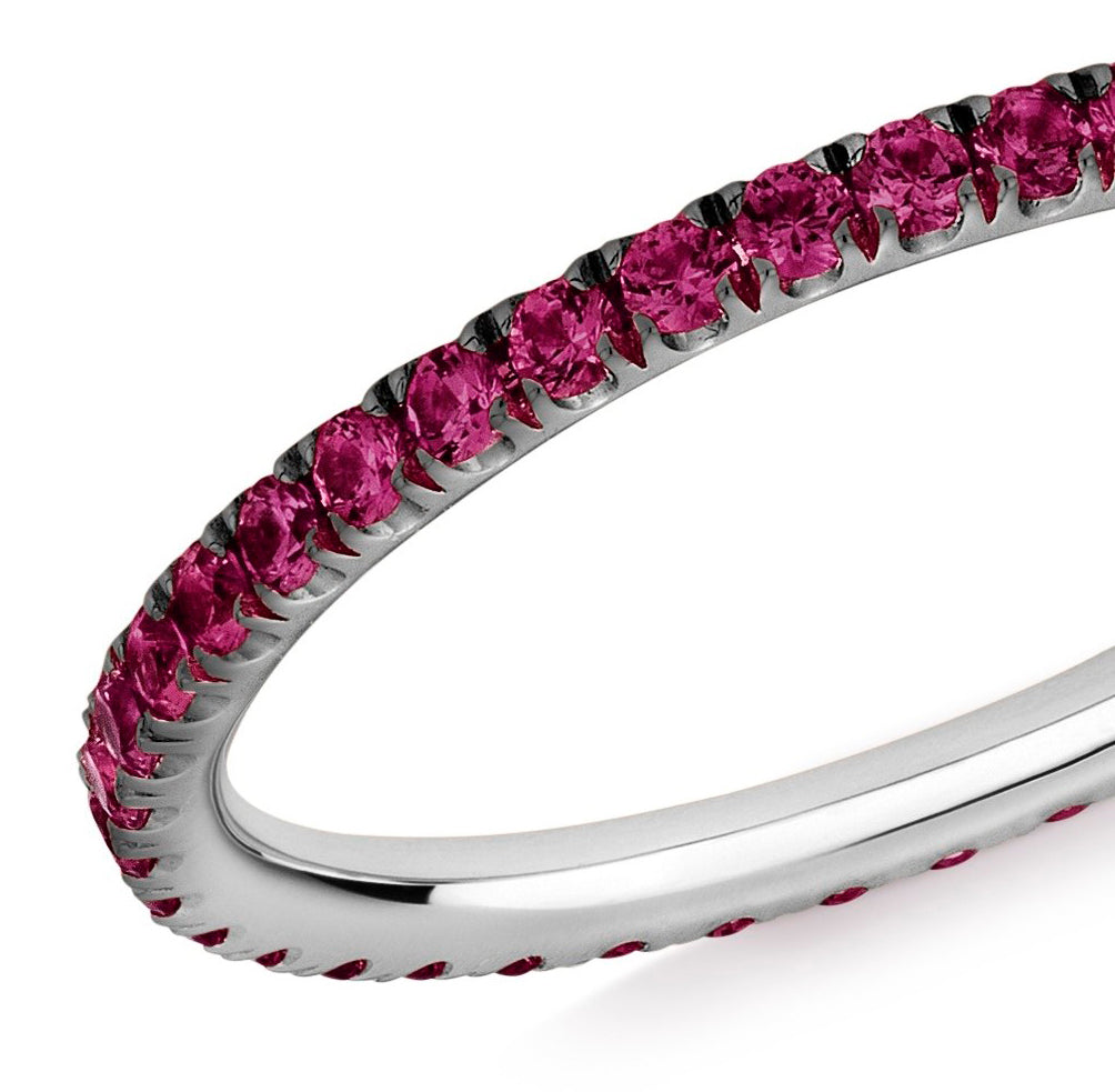Ein schmaler, tiefblauer Vorsteckring, der durchgehend mit natürlichen rosenfarben Saphiren besetzt ist, von denen jeder 1 Punkt wiegt. Wunderschön sowohl solo als auch in Kombination mit anderen schmalen Vorsteckringen von Verifine.