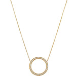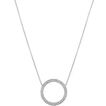 A classic round pendant crafted in 18ct white/ yellow gold. This design features a row of round natural brilliant cut diamonds on an open circle suspended at the '10 to 2 ' for elegance and stability on a fine yet strong 18ct white gold chain.