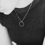 A classic round pendant set with 8 diamonds evenly spaced out, crafted in 18ct white gold and suspended on a fine yet strong 18ct white/ yellow gold chain.