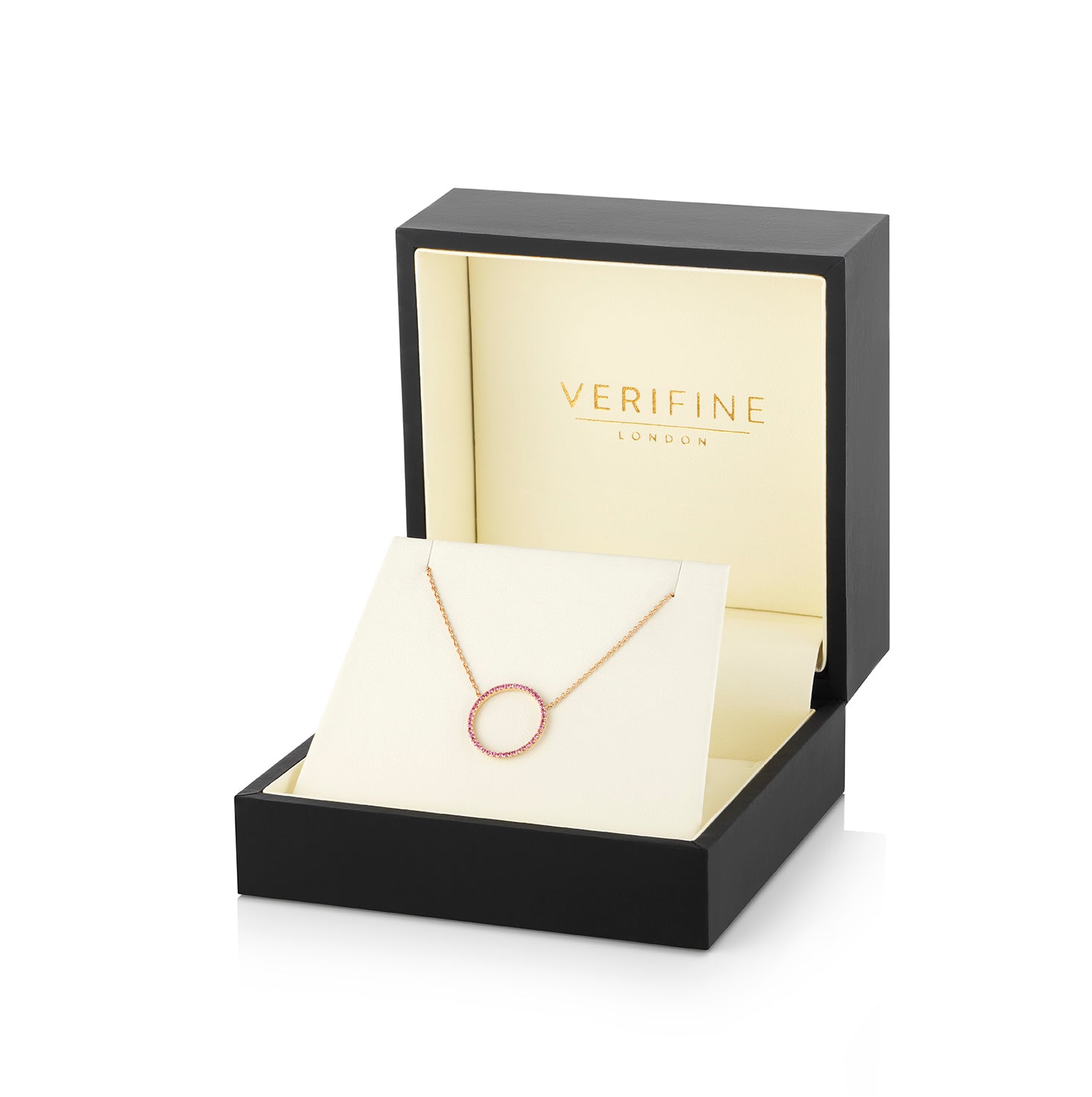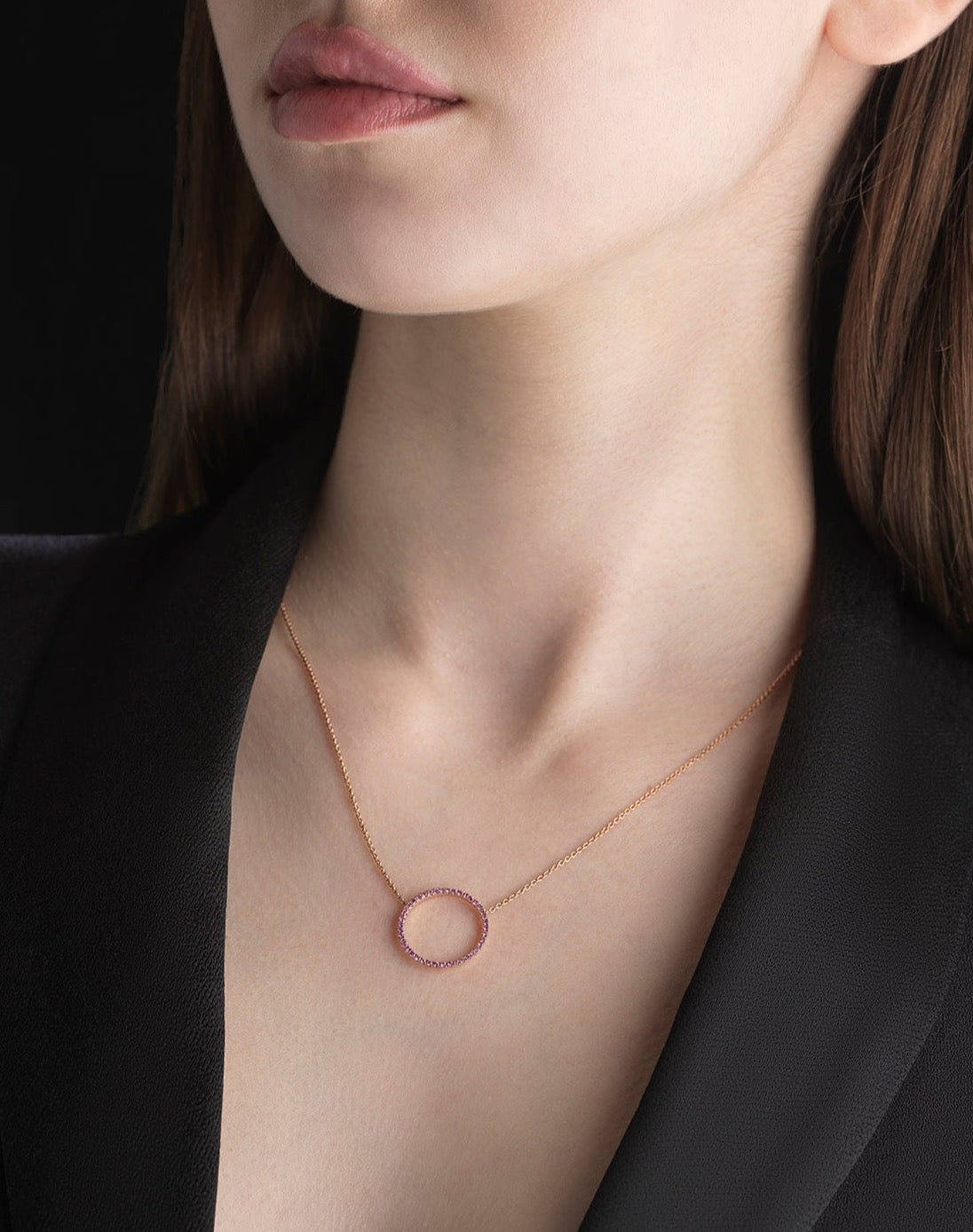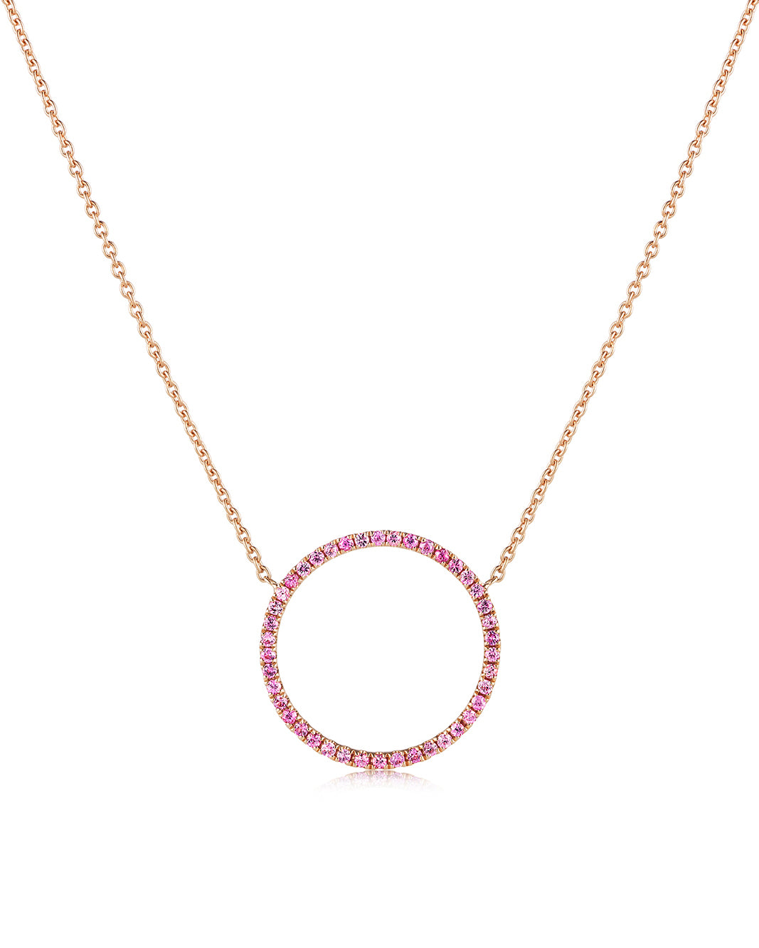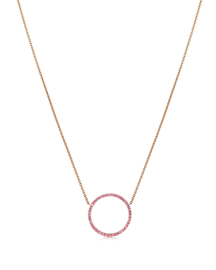 16mm pink sapphire circle pendant in 18ct rose gold.