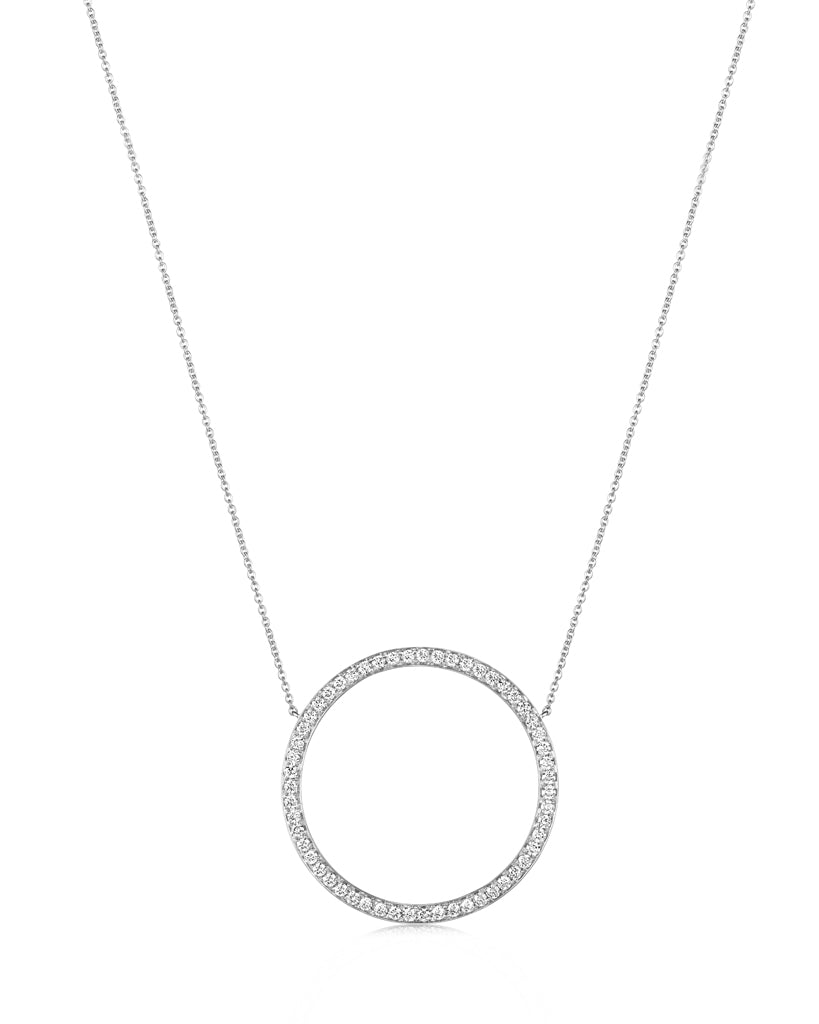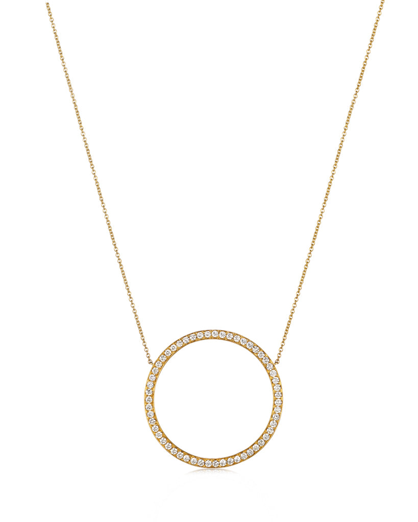 A classic round pendant crafted in 18ct white / yellow gold. This design features a row of round natural brilliant cut diamonds on an open circle suspended at the '10 to 2 ' for elegance and stability on a fine yet strong 18ct white/ yellow gold chain.
