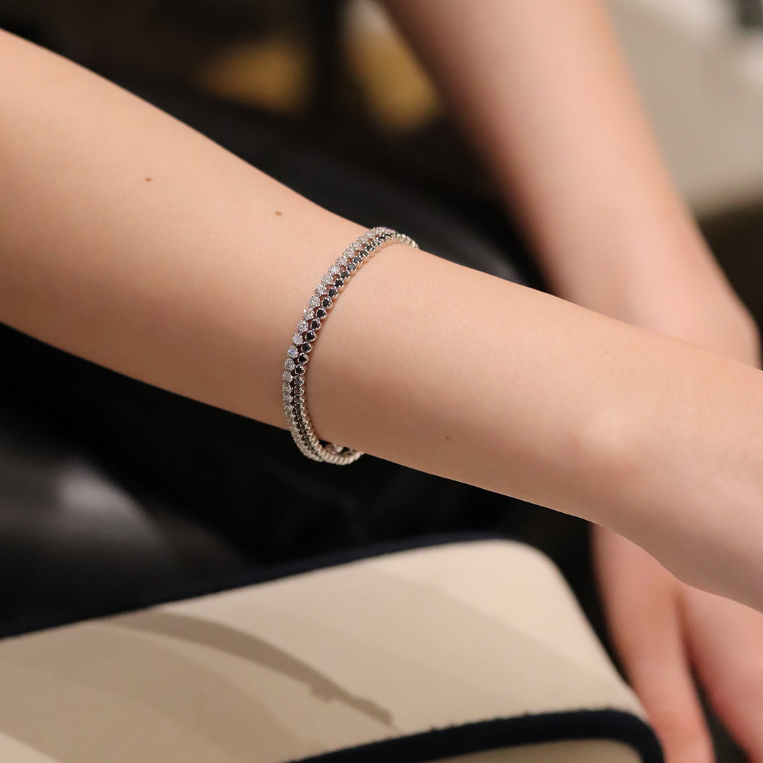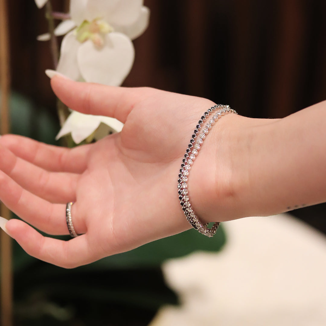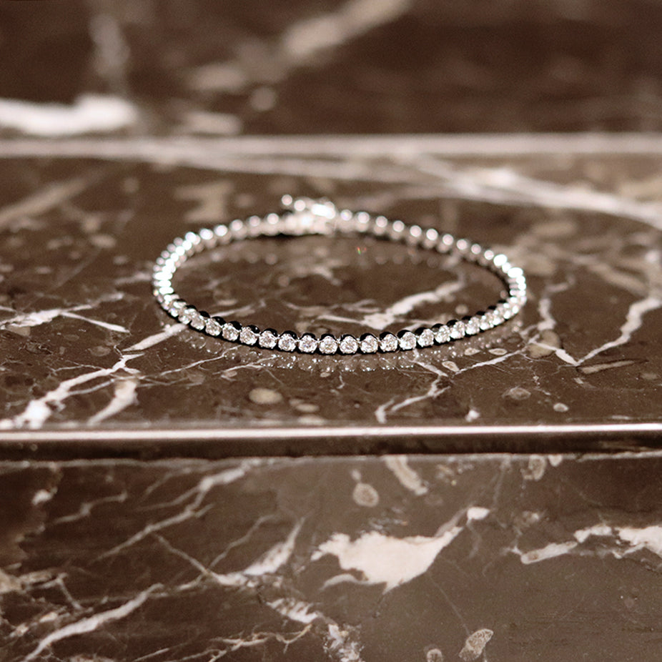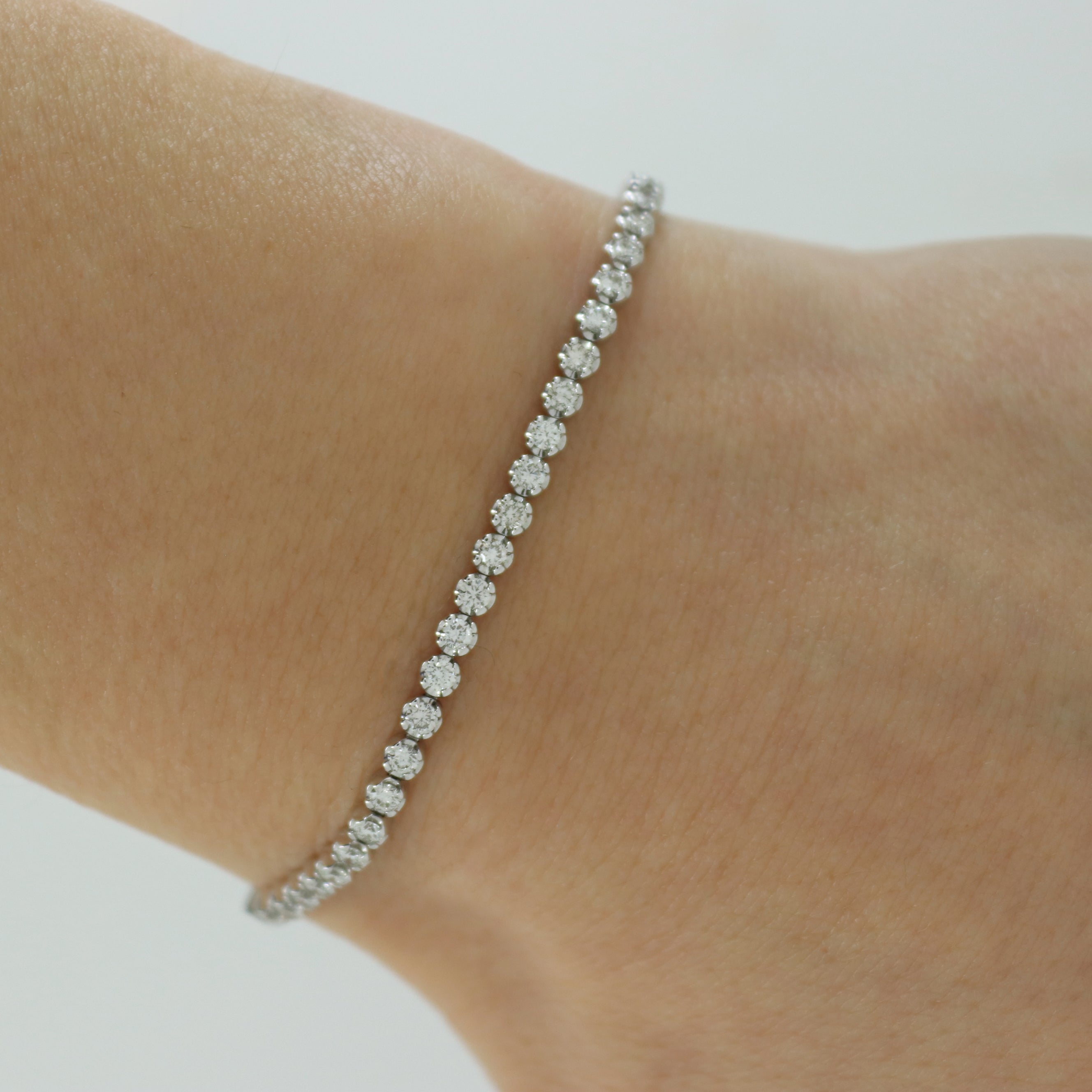 Classic tennis bracelet with round cut diamonds set in prong setting. This beautiful bracelet features a push clasp and double safety locks, It is available in 18ct white gold