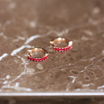 A pair of elegant round rose gold hoop earrings. Full circle earrings made in 18 carat rose gold, hinged with a bar fitting for piercings. Ruby-set forward facing half of the hoop. These handcrafted earrings are created to match our rings.