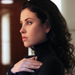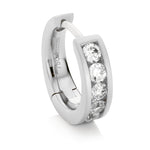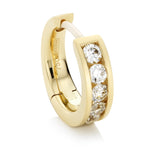 A pair of stylish wide small diamond hoop earrings. Hinged at the bottom, so that the pin can slide through your piercing and click securely back into place. These wide hoop earrings are half-set with diamonds. There are 6 diamonds set on the forward facing half of the hoop in each earring.